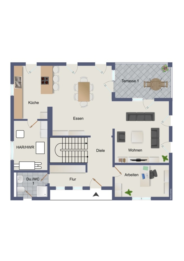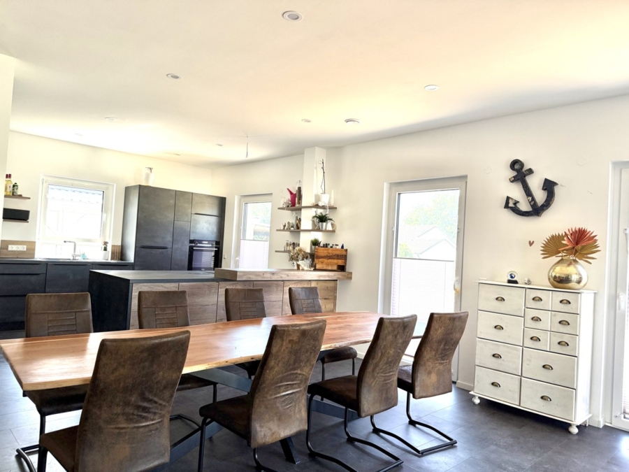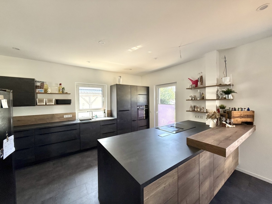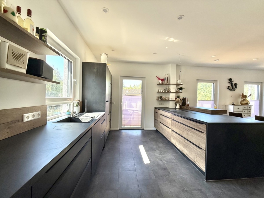 Die offene, moderne Küche ist nicht nur ein funktionaler Arbeitsbereich, sondern ein Ort, an dem gemeinsames kochen und genießen Freude bereiten. Von hier aus gelangt man direkt in den geräumigen Hauswirtschafts- und Technikraum.