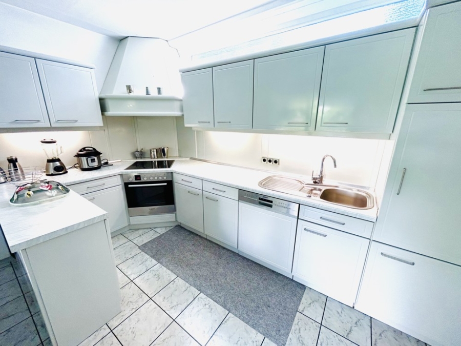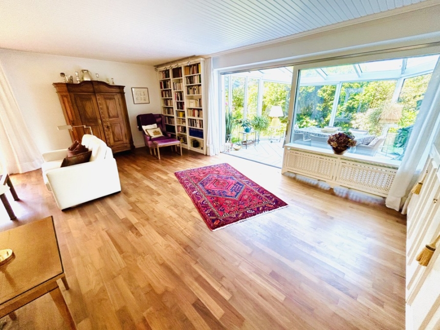 Wie mit den Echtholzböden. Und den weißen Innentüren. Wie mit den Marmorbädern. Und der Einbauküche. Wie mit den dreifach verglasten Fenstern. Sowie dem Wintergarten.
