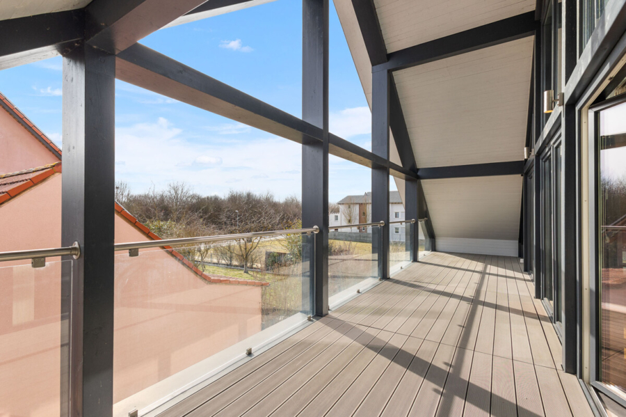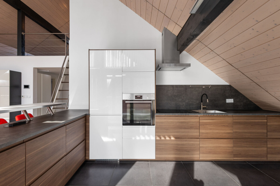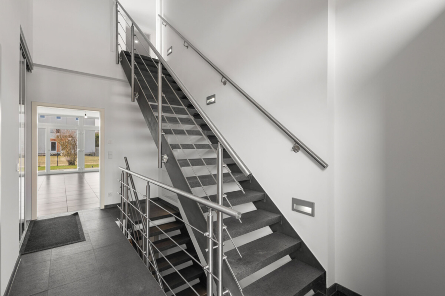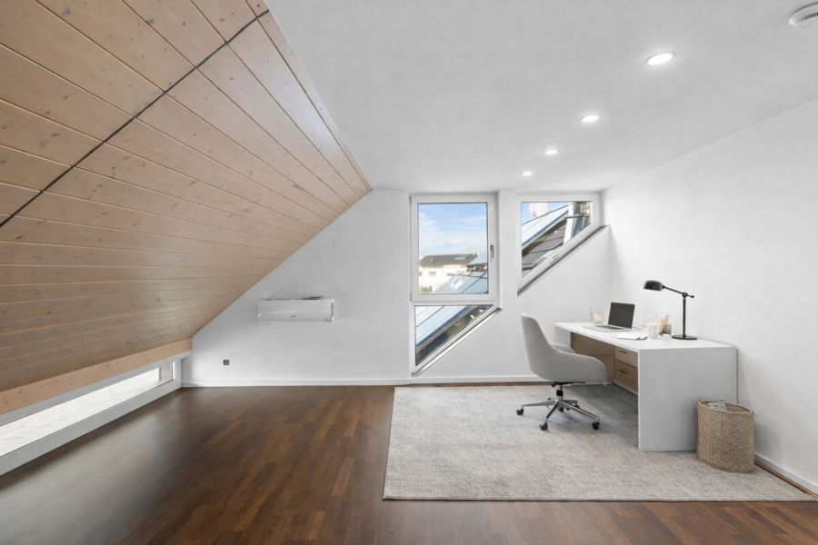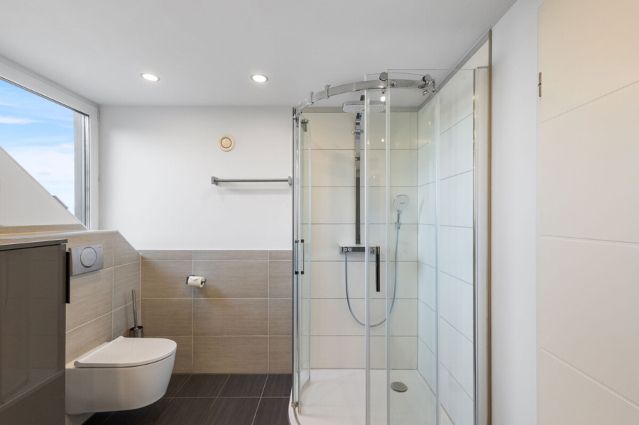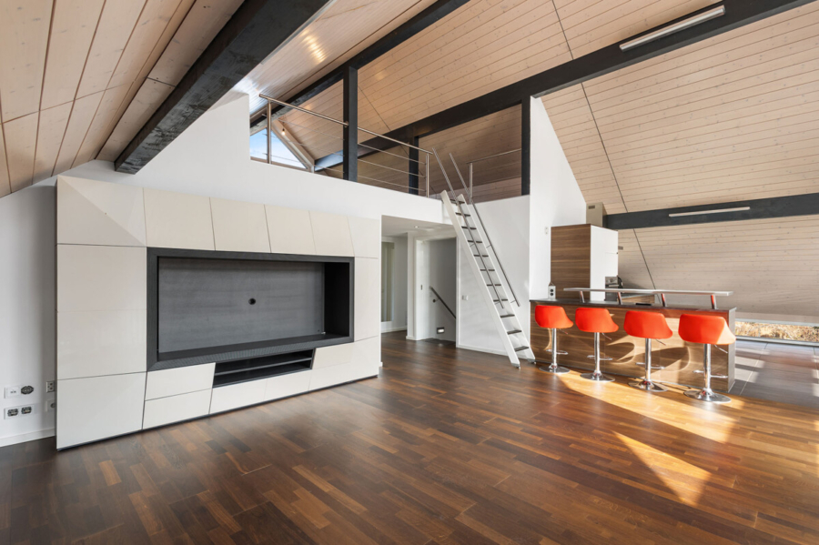 Ein ökologischer Ansatz zeigt sich in der fortschrittlichen Ausstattung: Solarthermie unterstützt die Heizung und wird durch eine Frischwasserstation ergänzt. Eine zentrale Be- und Entlüftung mit Wärmerückgewinnung sorgt für ein angenehmes Raumklima, während die Photovoltaikanlage mit einer Kapazität von 10 kW zur Energieeffizienz beiträgt.