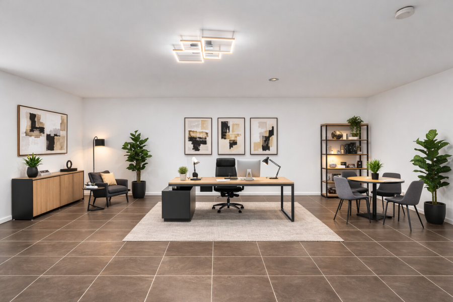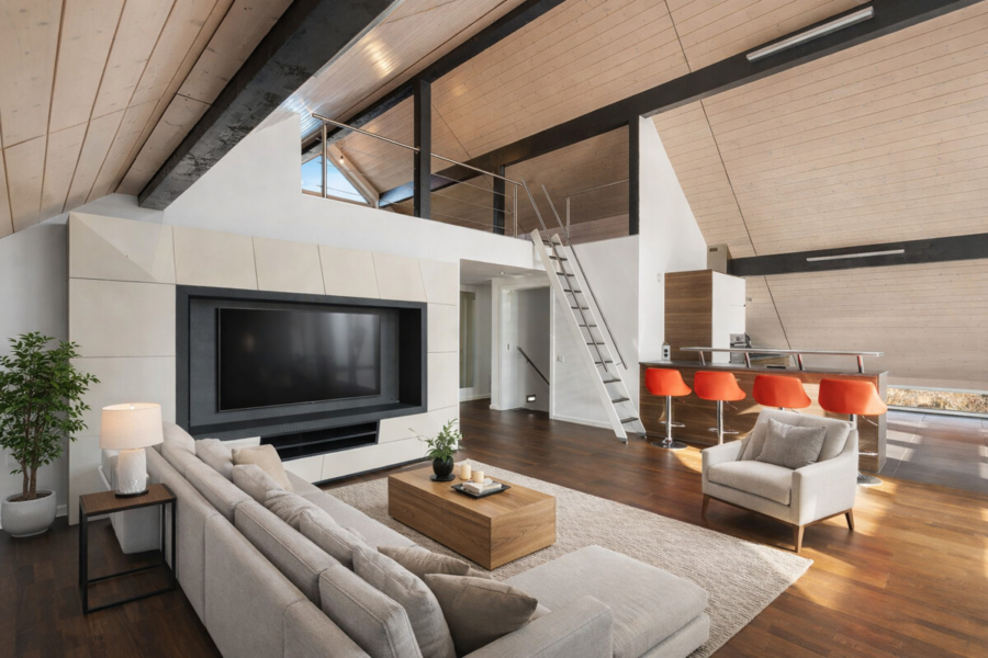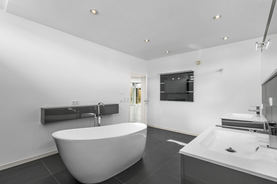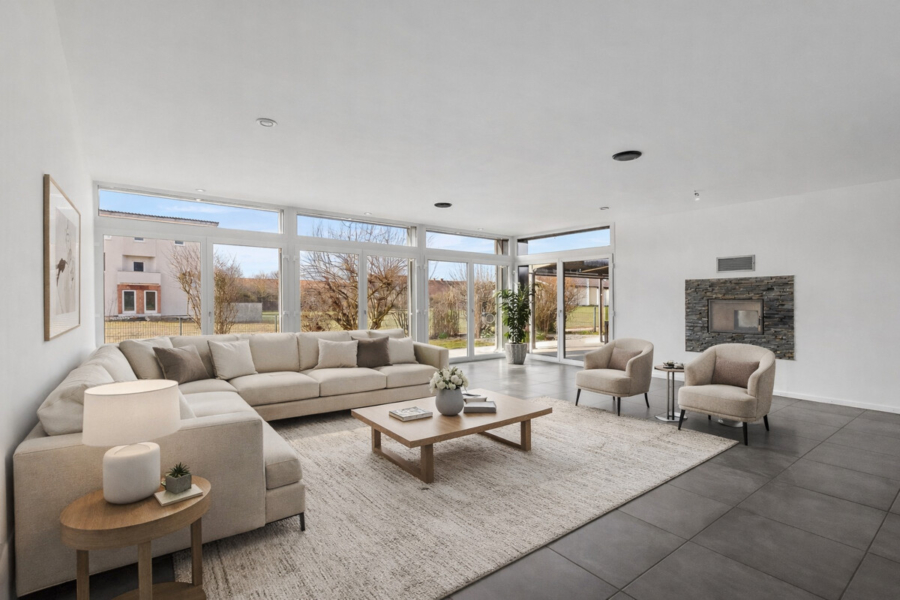Luxus und Komfort finden sich in vielen Details – von der Niedertemperaturheizung über die 3-fach verglasten Kunststofffenster bis zur zentralen Steuerung der Jalousien. Ein Glasfasernetzwerk garantiert modernes Arbeiten und Wohnen.