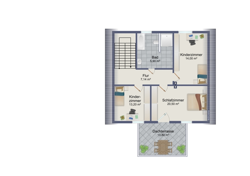 Über eine Holztreppe gelangen Sie in das Dachgeschoss. Hier finden Sie linker Hand das Hauptbadezimmer samt Wanne und Dusche vor. Drei Schlafzimmer runden das Dachgeschoss ab. Ein Highlight ist die nach Süden ausgerichtete Dachterrasse, welche man von Hauptschlafzimmer aus betreten kann.