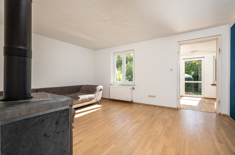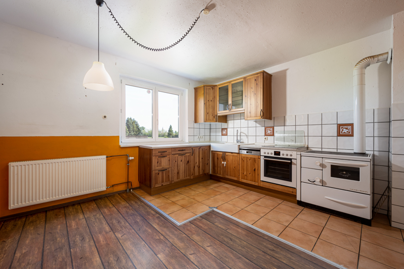 Im Wohnzimmer selbst sorgt ein Schwedenofen auch im Winter für wohlige Wärme. Zurück im Flur gelangen Sie geradewegs in die Wohn-Ess-Küche, welche mit einer Einbauküche sowie einem zusätzlichen Holzofen ausgestattet ist. Eine kleine, praktische Speisekammer schließt sich an die Küche an.