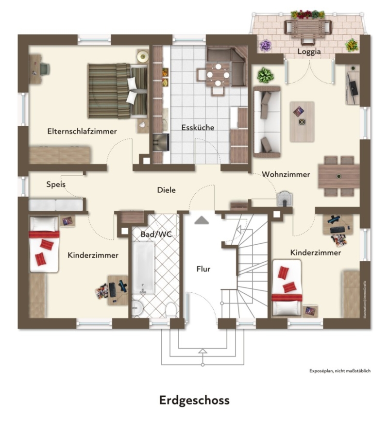 Ein praktischer Abstellraum und ein großzügiger Flur, der alle Räume miteinander verbindet, runden das Erdgeschoss ab.