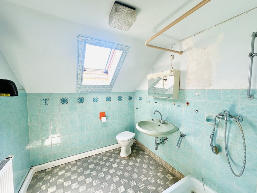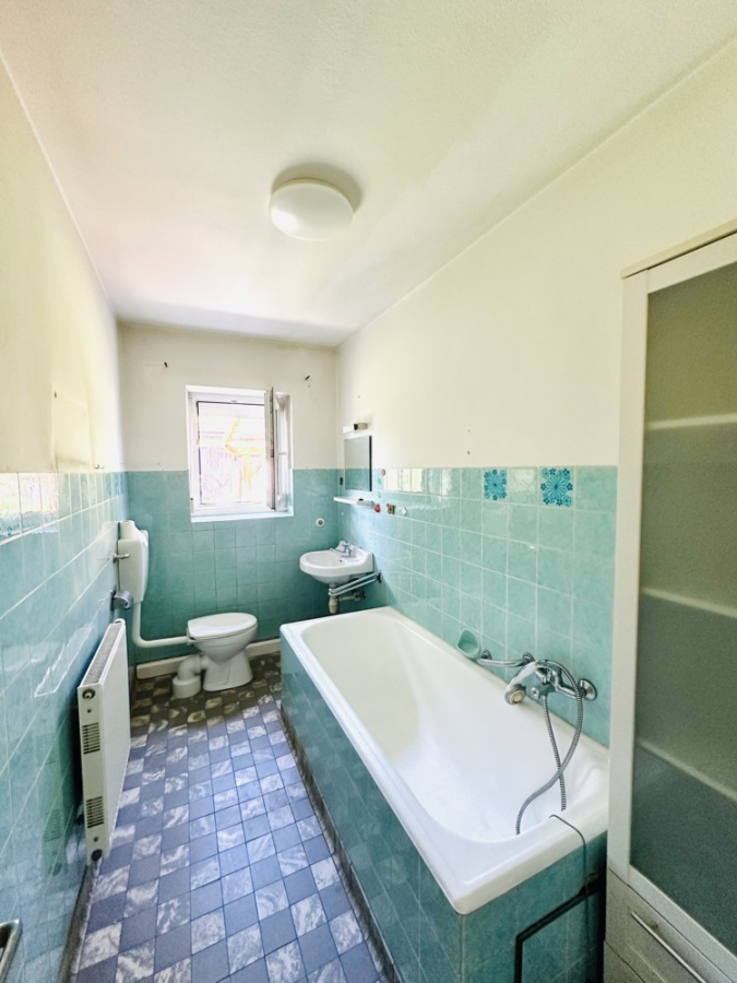 Das Badezimmer ist funktionell mit einer Badewanne , einem WC und einem Waschbecken ausgestattet und bedarf einer Renovierung.