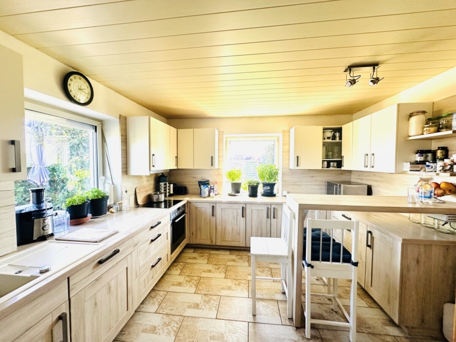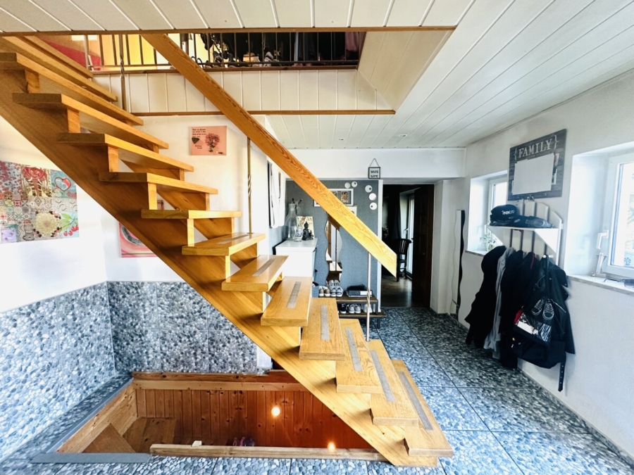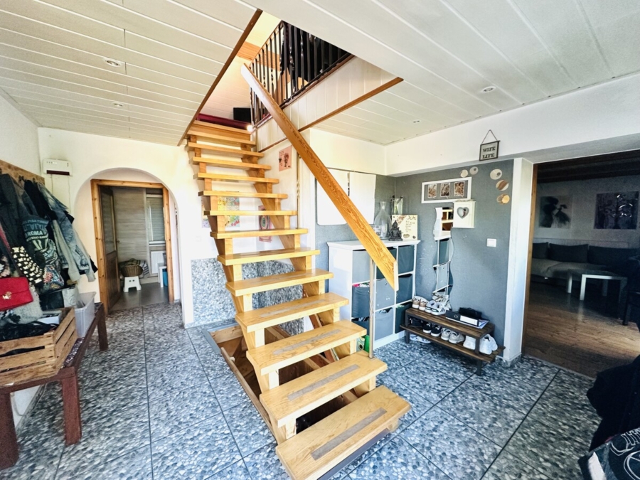 Das Haus überzeugt durch seine durchdachte Raumaufteilung und seinen gemütlichen Charme. Beim Betreten des Hauses gelangt man in den Eingangsbereich, von dem aus sich die Wohnräume im Erdgeschoss erschließen. Auf der linken Seite befindet sich die Küche, während rechts das Wohnzimmer mit Zugang zum Wintergarten liegt.