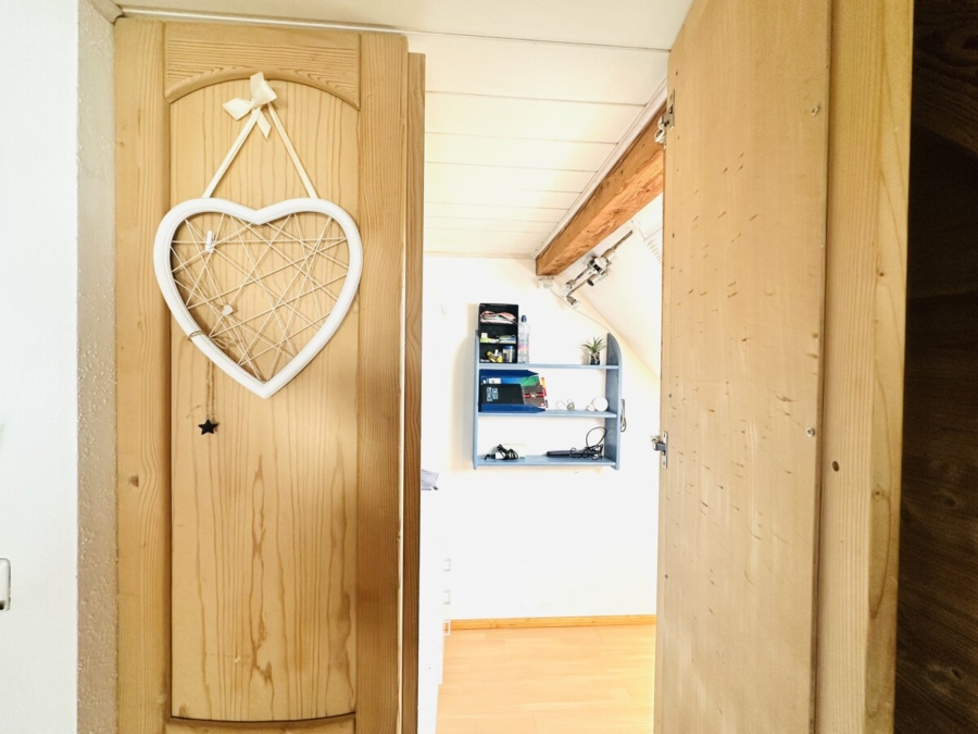 Zentral im Erdgeschoss ist die Treppe ins Obergeschoss platziert. Geradeaus gelangt man in das Badezimmer, das mit Dusche, Waschbecken, Waschmaschinen- und Trockneranschluss ausgestattet ist. Vor dem Badezimmer liegt auf der linken Seite ein weiteres Zimmer, das aktuell als Schlafzimmer genutzt wird, sich jedoch auch ideal als Esszimmer oder Arbeitszimmer anbietet.