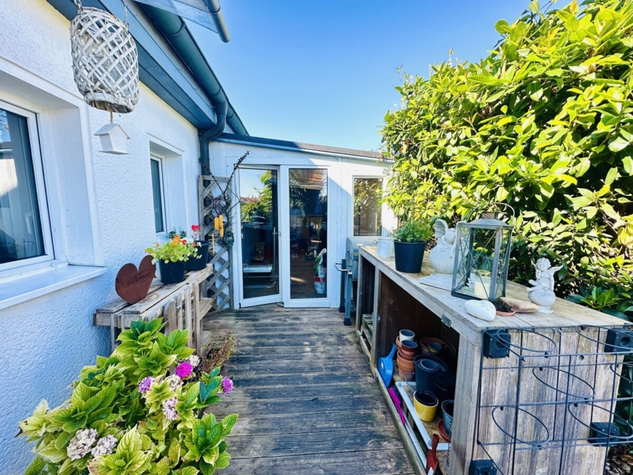 Das Grundstück ist gepflegt und bietet neben Grünflächen auch zwei praktische Carports, die mit Toren versehen sind und sich daher wie Garagen nutzen lassen. Eine gemütliche Terrasse sowie liebevoll angelegte Pflanzenbereiche schaffen eine angenehme Atmosphäre im Außenbereich und laden zum Verweilen ein.