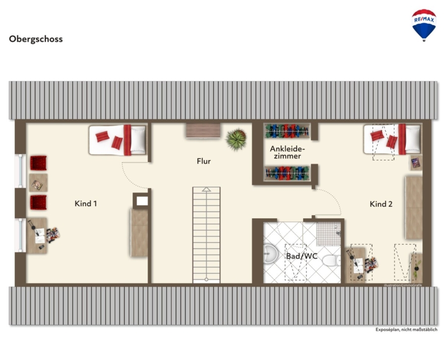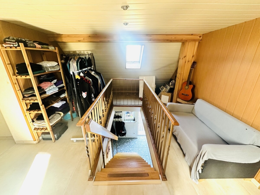 Im Obergeschoss empfängt ein großzügiger, offener Treppenhausbereich die Bewohner. Von hier aus führen die Türen in die Schlafräume: Zur linken Hand befindet sich ein Schlafzimmer, rechts ein weiterer Schlafraum mit angrenzender Ankleide. Auf dieser Etage befindet sich zudem ein weiteres Badezimmer mit WC, Waschbecken und Dusche.