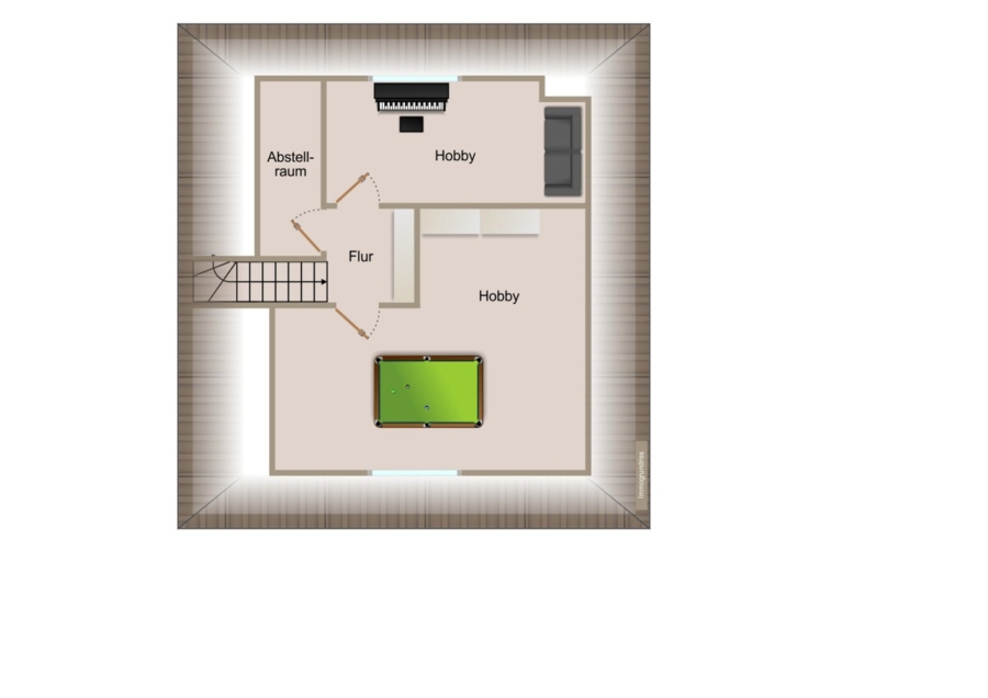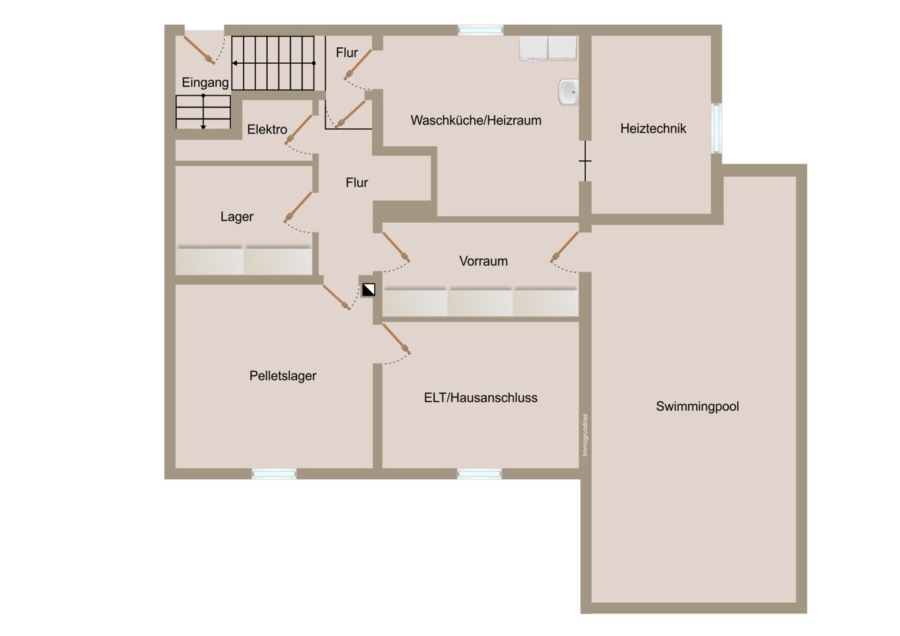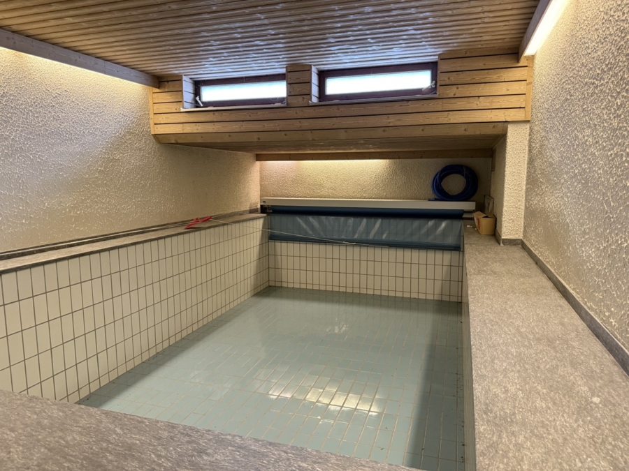 zwei Vollgeschoße mit Wohnräumen, das Dachgeschoß ist ausgebaut. Im gefliesten Keller befindet sich die Haustechnik und der Swimmingpool.