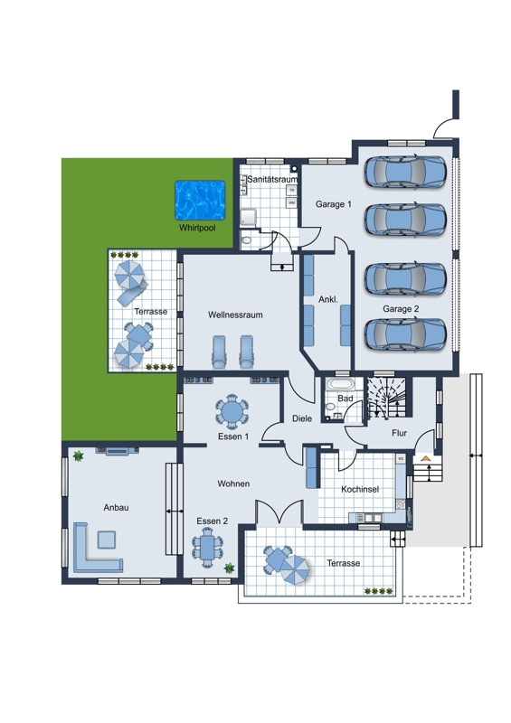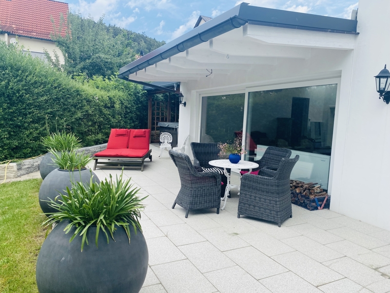 Entspannen Sie sich auf einer der drei Terrassen welche Sie durch die Küche, den Wohn- und Essbereich sowie vom Wellnessbereich erreichen.