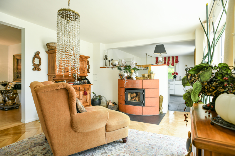 Zentrum des Wohnzimmers ist der gemütliche Kamin, der neben der angenehmen Wärme auch heizungsunterstützend ist.