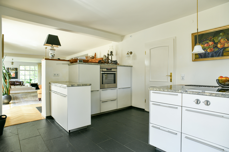 Zur Haustür eintretend befindet sich im EG der sehr großzügige und lichtdurchflutete Wohn- und Essbereich, eine komplett eingerichtete, offene Küche, das Gästebadezimmer mit einer Dusche und auch der Zugang zum Wellnessbereich.