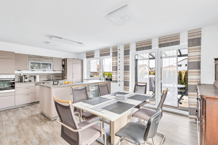 Der lichtdurchflutete Wohn- und Essbereich öffnet sich zur Süd/Ost-Terrasse und dem liebevoll angelegten Garten – ein idealer Platz, um zur Ruhe zu kommen oder gemeinsame Momente mit Familie und Freunden zu genießen.