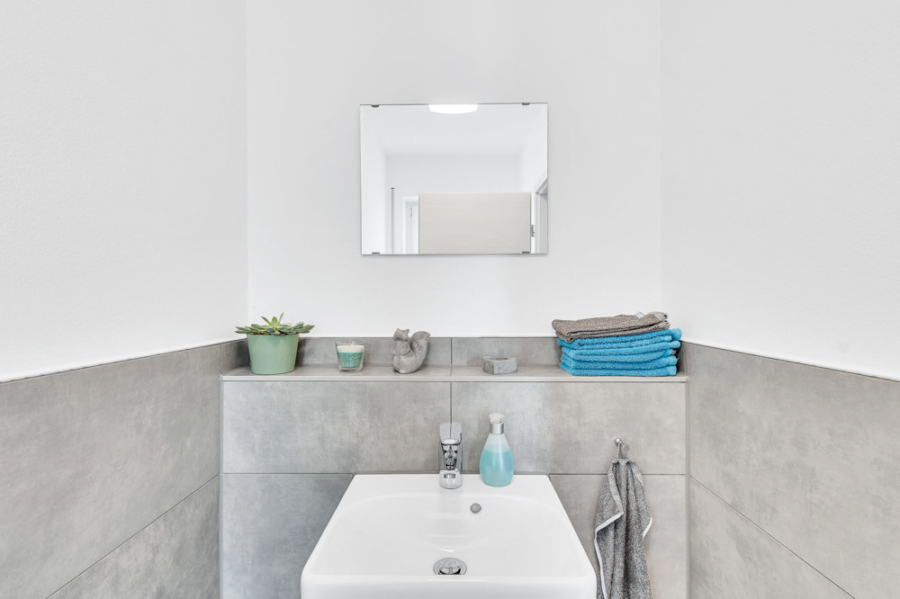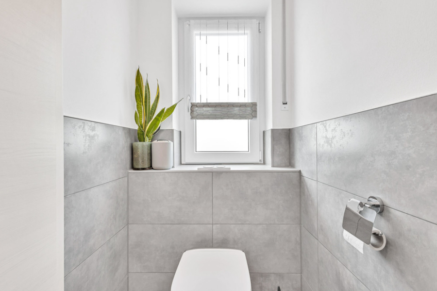 Vom Flur des Erdgeschosses aus erreichen Sie nicht nur den Hauswirtschaftsraum, der ebenso einen Zugang zur Terrasse aufweist, sondern auch das hochwertige Gäste-WC.