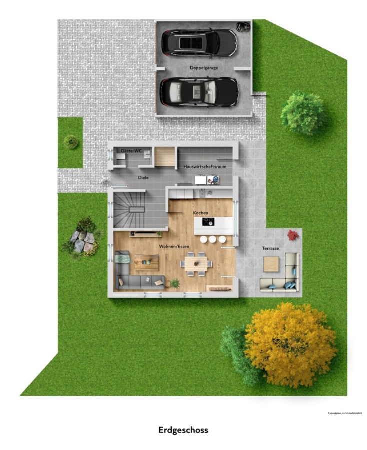 Ein besonderes Highlight ist die vollwertige Doppelgarage, die nicht nur Platz für zwei Fahrzeuge bietet, sondern auch zusätzlichen Stauraum für Fahrräder, Gartengeräte oder Freizeitbedarf.