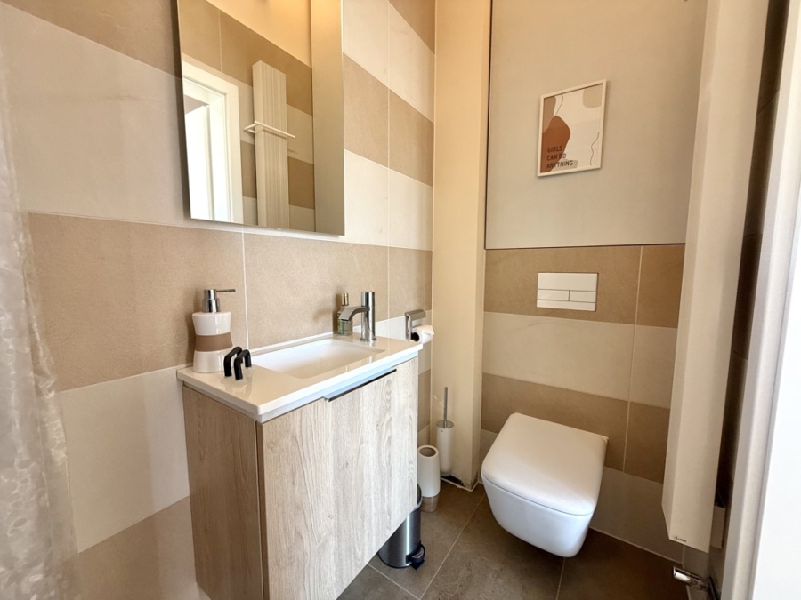 Eine halbe Treppe tiefer befindet sich das großzügige Wohnzimmer, das zum Entspannen und Verweilen einlädt. Eine weitere halbe Treppe führt Sie zu einem WC mit Waschbecken. Von diesem Bereich aus haben Sie auch Zugang zur Garage, die genügend Platz für Ihr Fahrzeug bietet.