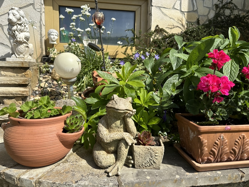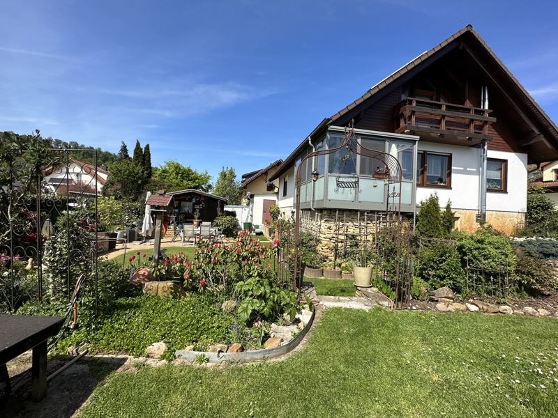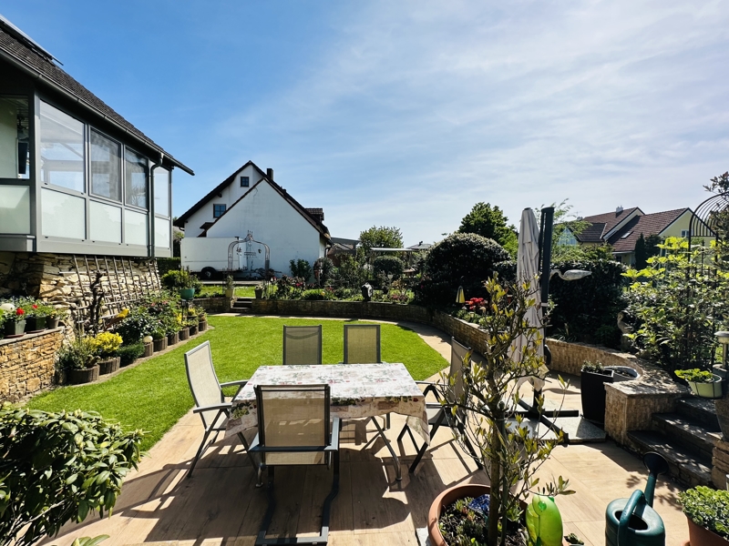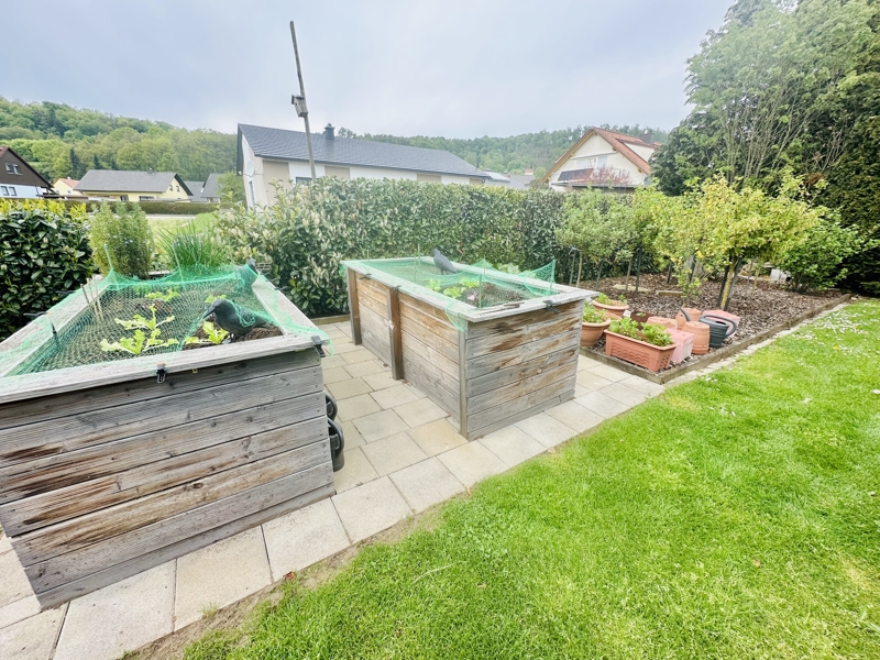 Der Garten ist wunderschön angelegt und bietet viele Möglichkeiten. Zwei Hochbeete mit Obst und Gemüse, ein Brunnen, eine Blockhütte mit Bartheke für Partys und ein Grillplatz sind vorhanden. Zum Haus gehört eine Doppelgarage sowie ein großer Stellplatz, welcher auch Platz für ein Wohnmobil bietet.