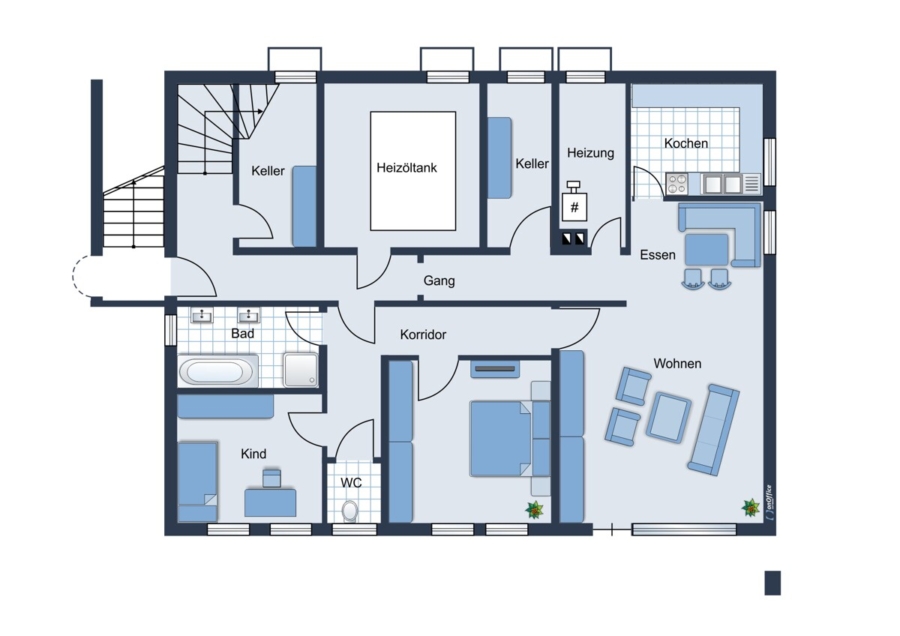 Besonders hervorzuheben ist die separate Einliegerwohnung mit eigenem Zugang, die vielfältige Nutzungsmöglichkeiten bietet – sei es für erwachsene Kinder, Gäste oder als Büro.