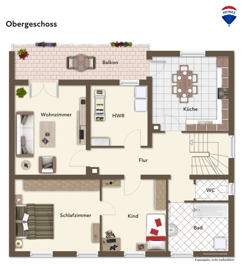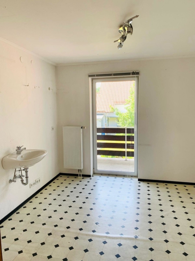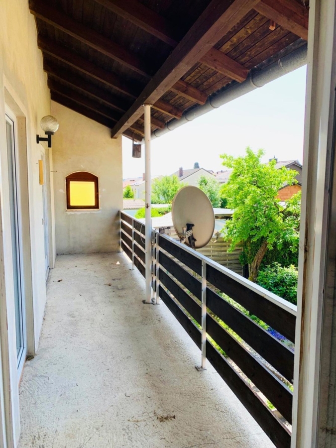 Der Zugang erfolgt über das Treppenhaus. Oben angekommen, gelangen Sie vom Flur aus rechter Hand direkt in die Küche, von der aus Sie den Balkon betreten können – perfekt für ein Frühstück im Freien. Links vom Flur befindet sich das große Badezimmer mit zusätzlichem Gäste-WC.