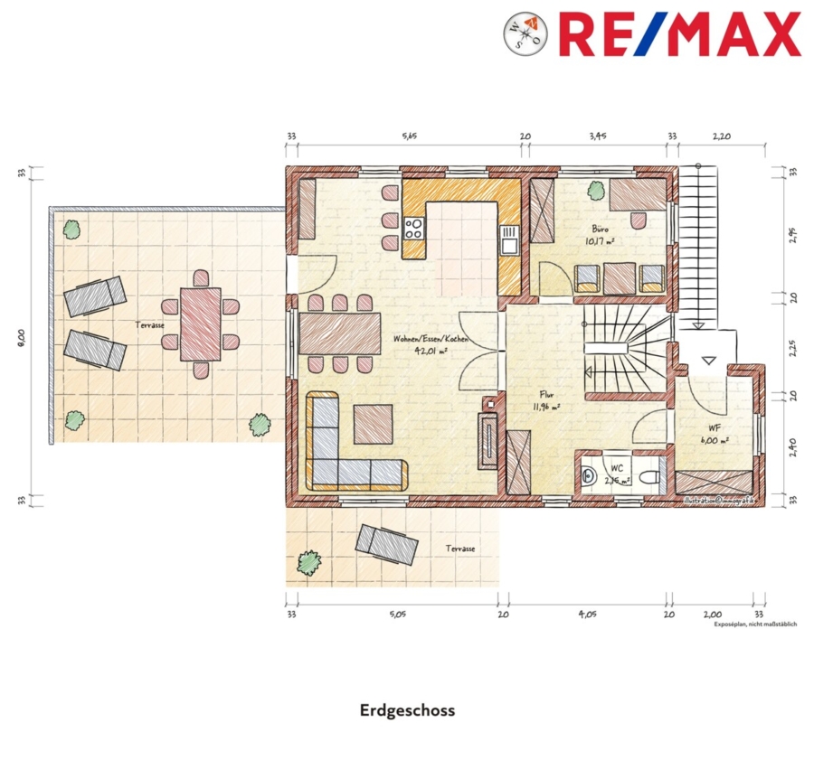 Windfang, große Diele, Gäste WC, Büro oder Kinderzimmer, Offene Wohnküche- und Essbereich mit Zugang zur großen Terrasse