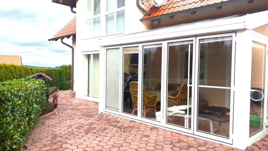 Der großzügige Garten verfügt über eine Terrasse und einen mit Fußbodenheizung sowie Sonnenschutz versehenen Wintergarten. Die separate Doppelgarage mit Giebeldach und das vom Kunstschmied gefertigte Einfahrtstor lassen sich elektrisch bedienen.