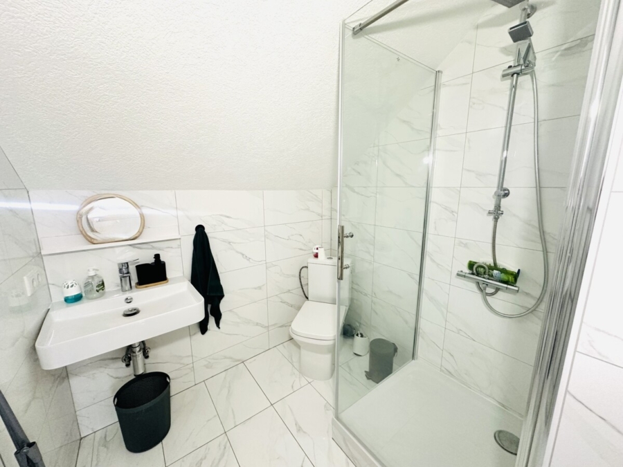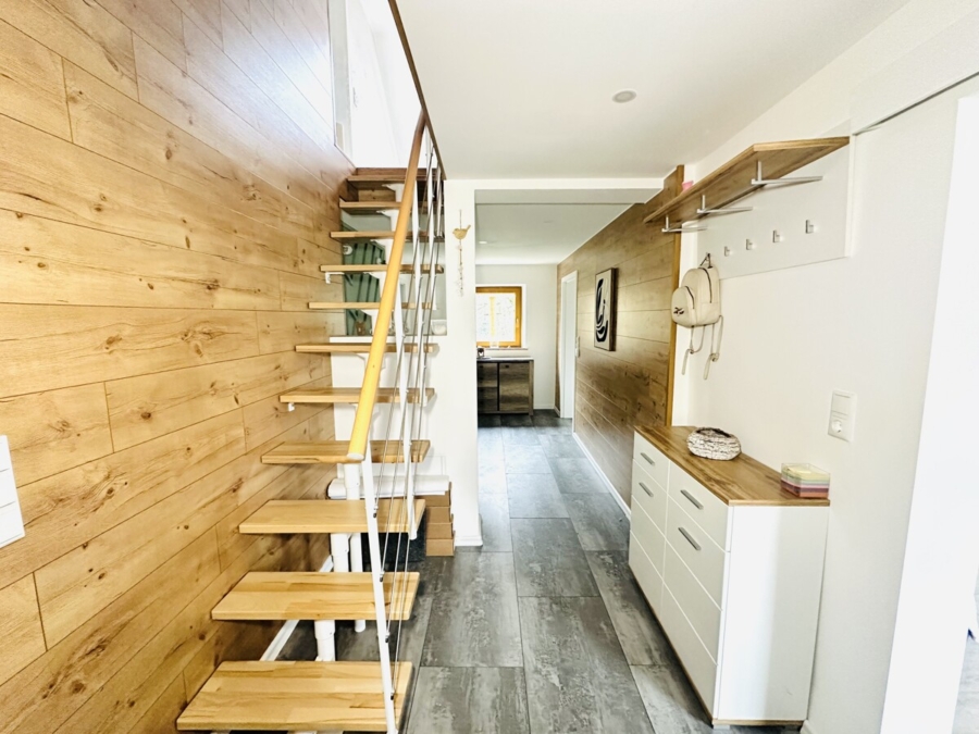 Beim Betreten des Hauses empfängt Sie zur linken Seite ein modernes, stilvoll ausgestattetes Badezimmer mit einer großzügigen, ebenerdigen Dusche. Rechts befindet sich das gemütliche Wohnzimmer, das mit seiner angenehmen Atmosphäre zum Entspannen und Wohlfühlen einlädt. Der Eingangsbereich wird von einer hochwertigen Holztreppe akzentuiert, die harmonisch in das Obergeschoss führt.
