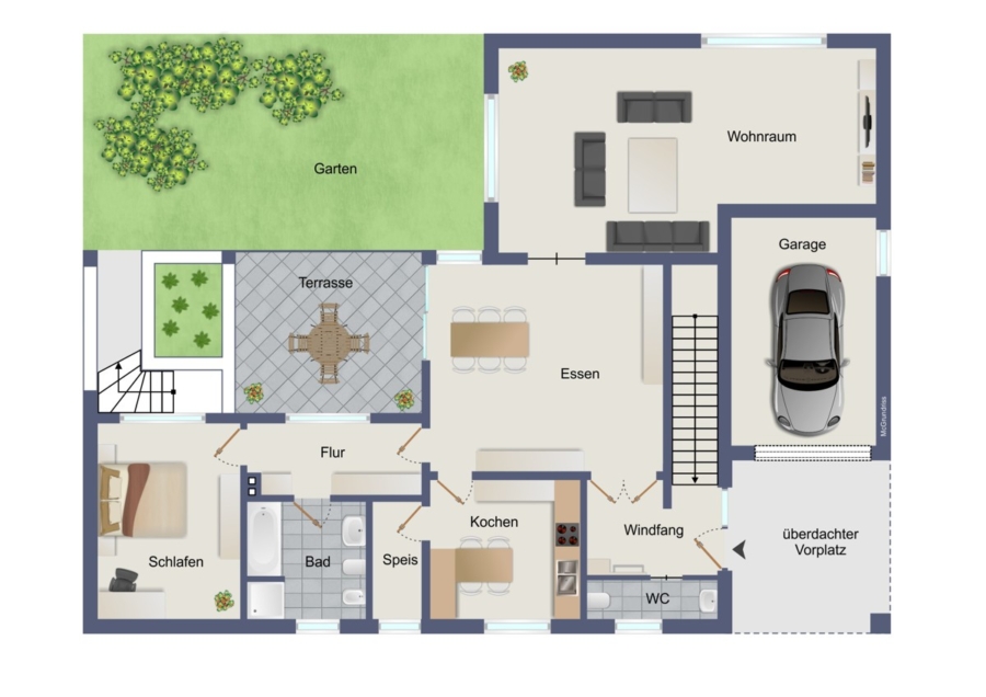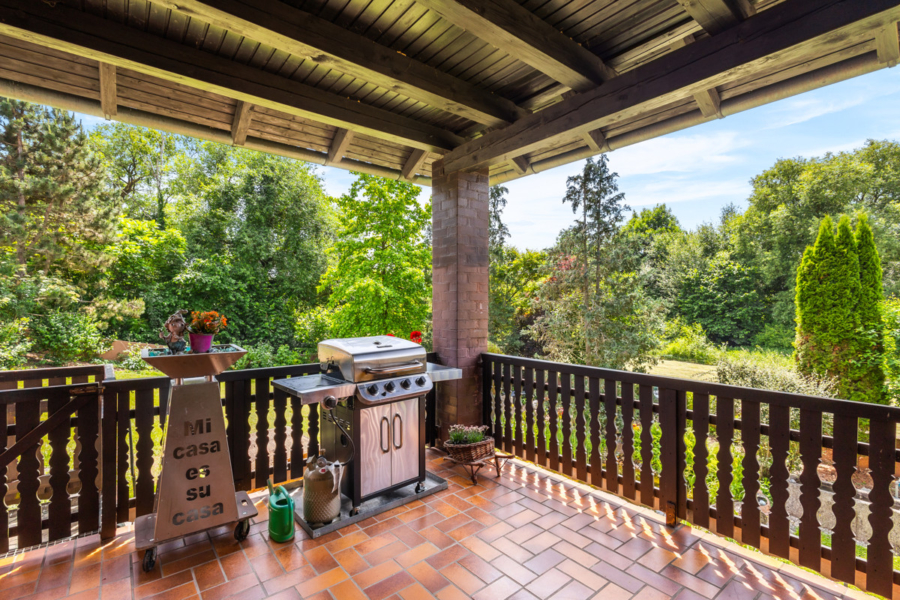 - Terrasse: Vom Essbereich gelangen Sie auf die große, überdachte Terrasse, die einen direkten Zugang zum Garten bietet.