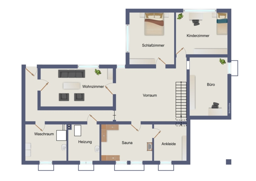 - Hauswirtschaftsräume: Heizungsraum und Waschküche, beide mit Fenster.