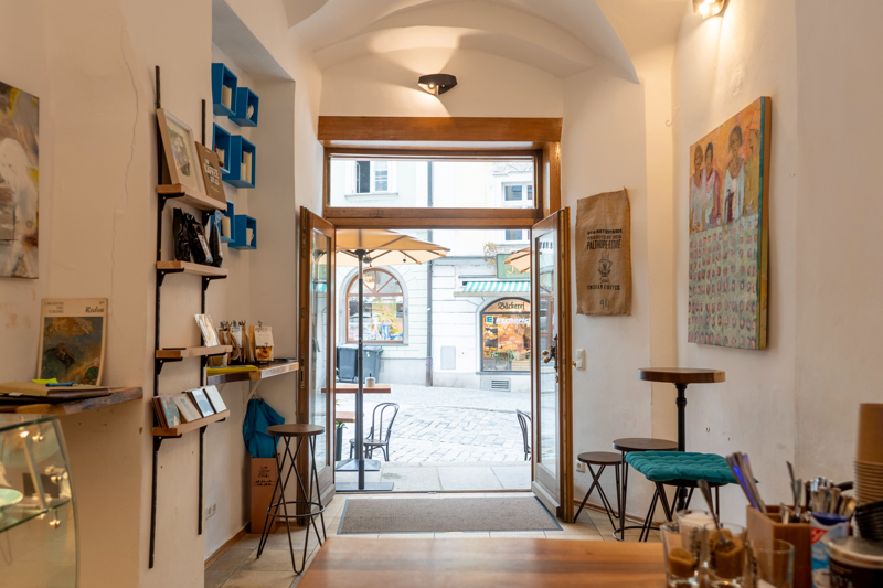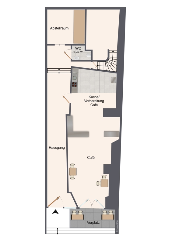 Im Erdgeschoss befindet sich zunächst eine kleine, schicke Kaffee-Bar samt eigenem Außenbereich. Über einen Hausgang mit Kreuzgewölbe erreicht man nicht nur eine Toilette (zur Gastronomie gehörig), sondern auch einen Abstellraum sowie integrierten Fahrradraum.