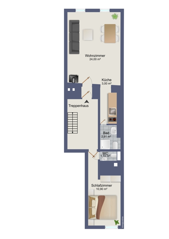 Über eine innenliegende Treppe gelangt man in die einzelnen Etagen. Vom ersten bis zum dritten Stock sind diese Zweizimmer-Wohnungen sehr ähnlich aufgebaut: Man betritt geradewegs vom Flur aus über eine Zwischentür das ca. 24 Quadratmeter große Wohn-Ess-Zimmer, welches mit Stuckdecken ausgestattet ist. Rechter Hand geht es in die maßgefertigte Einbauküche – teils mit Echtholz sowie Granit-Arbeitsplatten versehen. Von der Küche aus erreichen die Mieter ihr Badezimmer. Über den Treppenflur geht es in den hinteren Teil der jeweiligen Wohnung: Hier befindet sich neben einem Schlafzimmer ein zusätzliches WC.