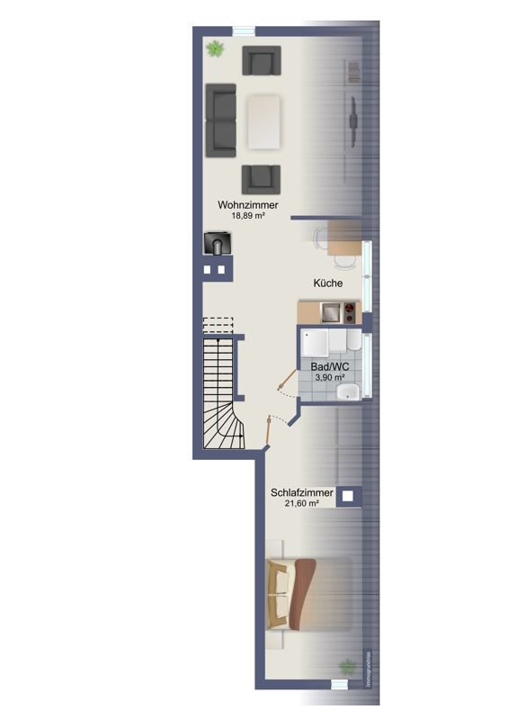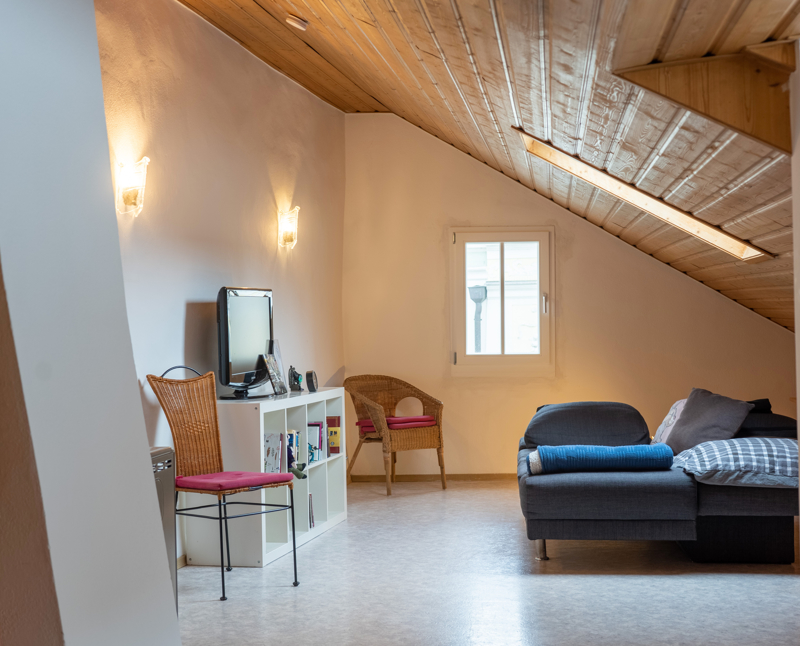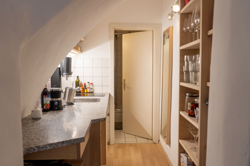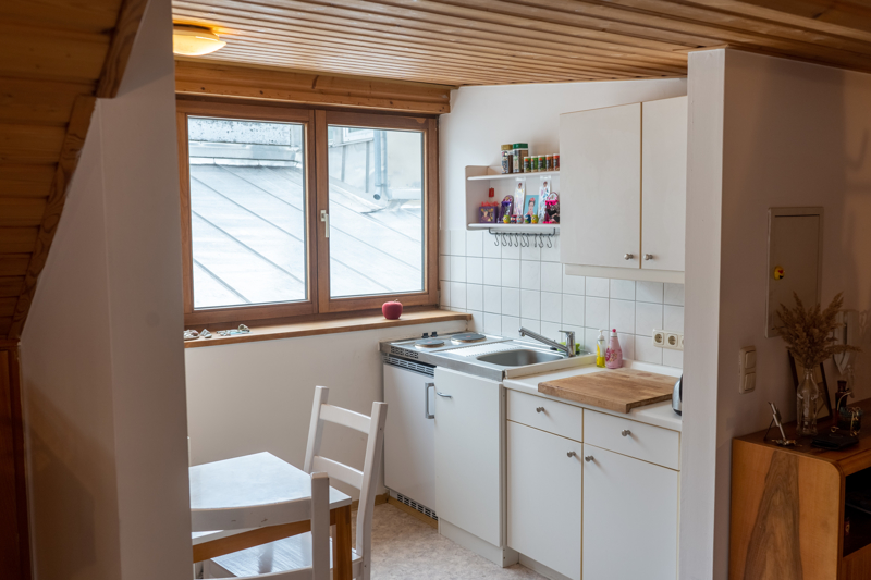 Die Wohnung im Dachgeschoss ist ähnlich im Schnitt aufgebaut. Eine Dachgaube sorgt in der Küche und im Badezimmer für eine gute Raumhöhe. Das Wohnzimmer und das Schlafzimmer sind hier von Dachschrägen geprägt – durch den offenen Charakter tut dies einem angenehmen Raumgefühl keinen Abbruch.