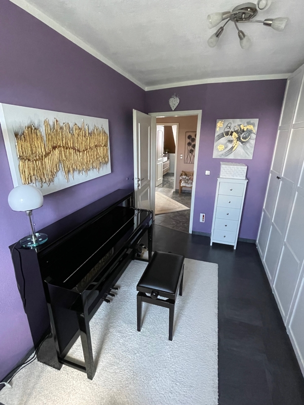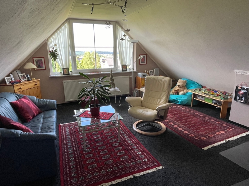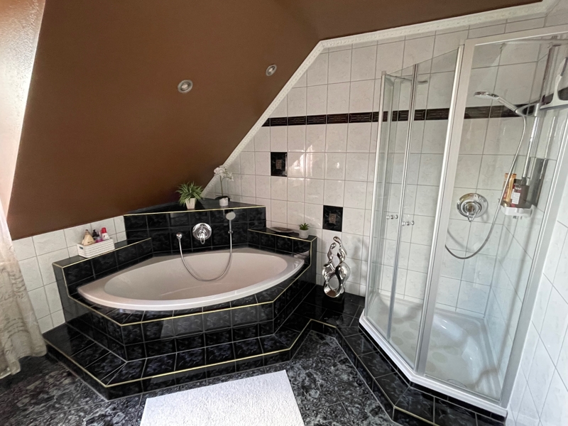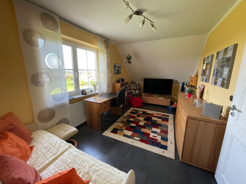 Im Obergeschoss sind zwei Kinderzimmer, das Elternschlafzimmer und das Masterbad (mit Eckbadewanne und separater Dusche) untergebracht. Ein zusätzlicher Raum mit tollem Ambiente wurde durch den Ausbau des Dachstudios geschaffen. Hier lässt sich z. B. ideal ein Homeoffice-Arbeitsplatz oder ein Gästezimmer unterbringen.