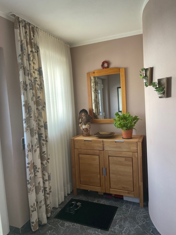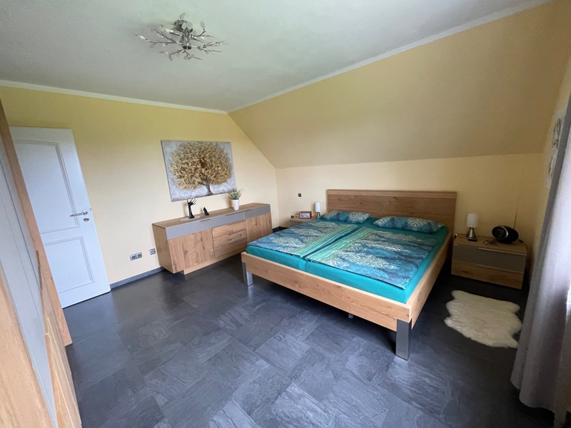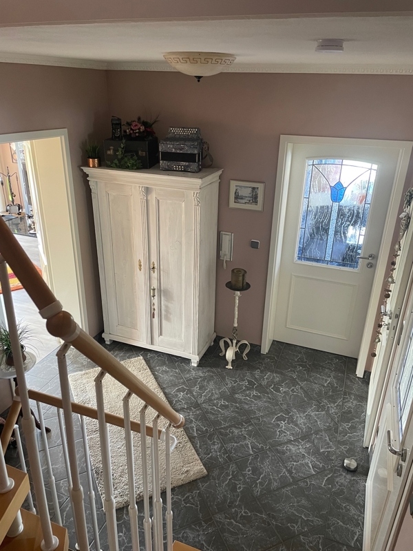 Des Weiteren liegt das Haus direkt am Ortsrand. Dies bedeutet zum einen eine absolut ruhige Lage, zum anderen bietet dieser Standort auch noch eine Traumaussicht über die Felder bis zum Waldrand, wo Sie regelmäßig Rehe und Hasen beobachten können.