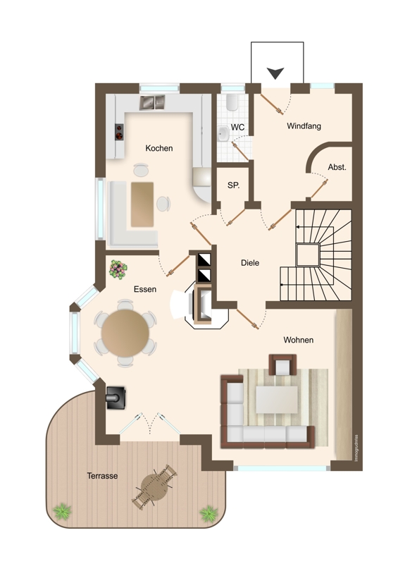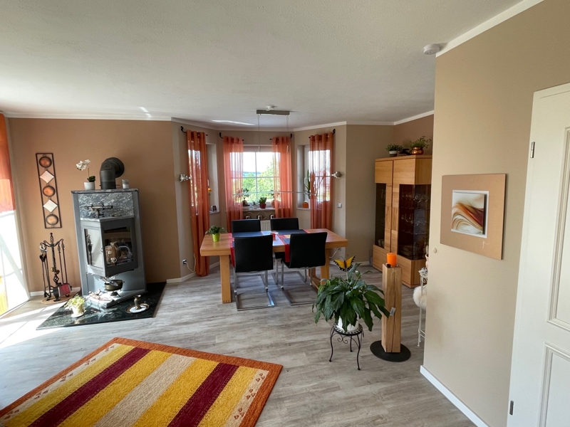 Der Grundriss ist funktional und gut durchdacht. Schon beim Eintreten überzeugt ein großzügiger Eingangsbereich. Der Wohn-/Essbereich ist hell und freundlich, ein Eyecatcher ist der Design-Ofen aus Dänemark. Die Küche ist von zwei Seiten belichtet und bietet zusätzlichen Platz für eine gemütliche Sitzecke.