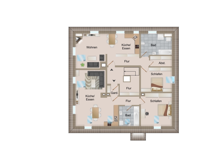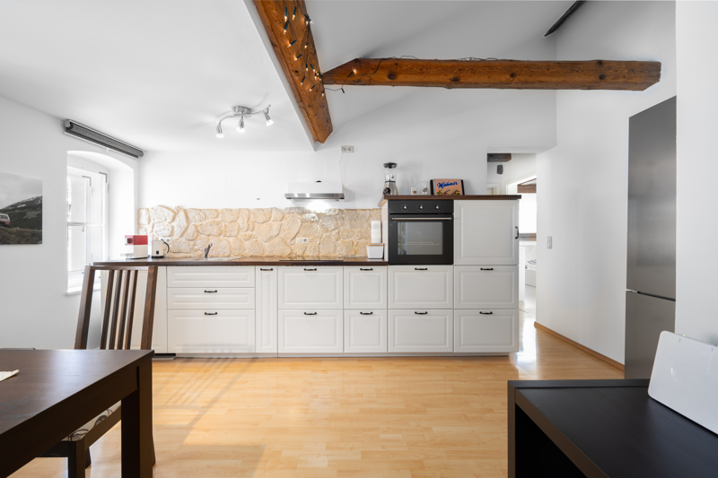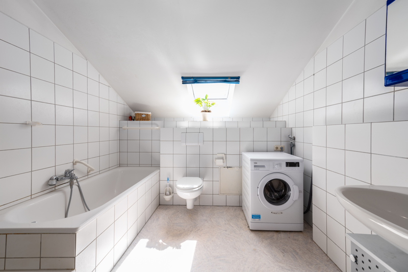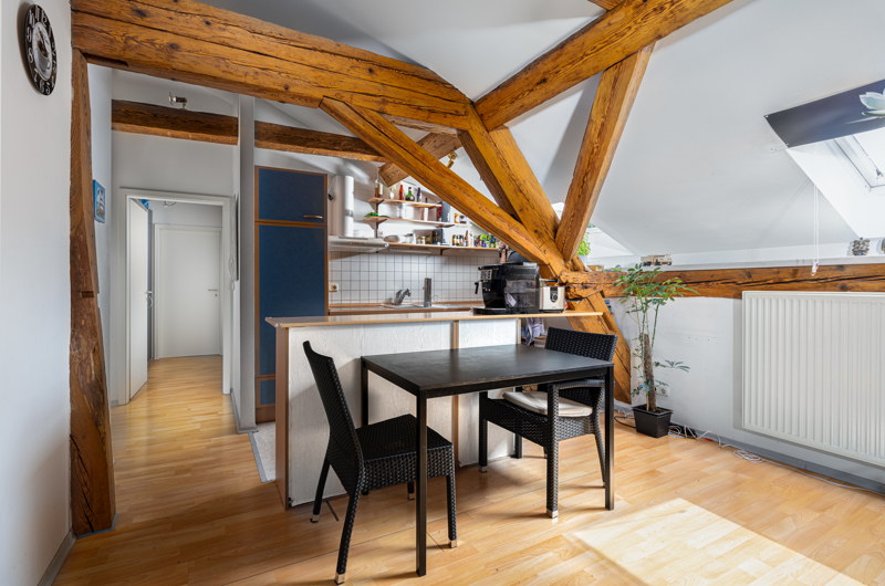 Über die großzügige Treppe gelangen Sie weiter ins Dachgeschoss, in dem zwei weitere Wohnungen untergebracht sind. Rechter Hand gelangen Sie zunächst in eine ca. 75 Quadratmeter große Wohnung (Wohnung 3). Hier sind die massiven, historischen Sichtbalken ein echter Blickfang. Neben des offenen Wohnbereiches finden hier ein großzügiges Bad (samt Wanne und Dusche), ein Abstellraum sowie ein Schlafzimmer Platz. Eine fast gleich große Dachgeschosswohnung befindet sich gegenüber (Wohnung 4). Auch hier sorgen die historischen Sichtbalken für ein besonderes Wohngefühl. Neben einer offenen Küche und eines großzügigen Wohn-Ess-Bereiches, gibt es auch hier ein separates Schlafzimmer und ein modernes Bad samt Badewanne und Dusche.
