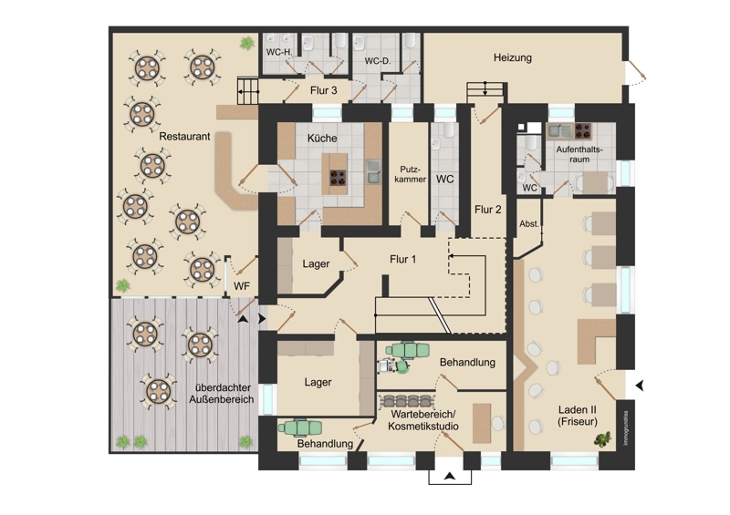 Im Erdgeschoss sind zwei Gewerbe und ein Restaurant untergebracht. Das griechische Restaurant hat einen guten Ruf und ist nicht nur den Ortsansässigen bekannt. Direkt daneben befindet sich ein modern eingerichtetes Kosmetik- und Wellnessstudio. Ein großzügiger Friseurladen mit großem Kundenstamm schließt das Erdgeschoss ab.