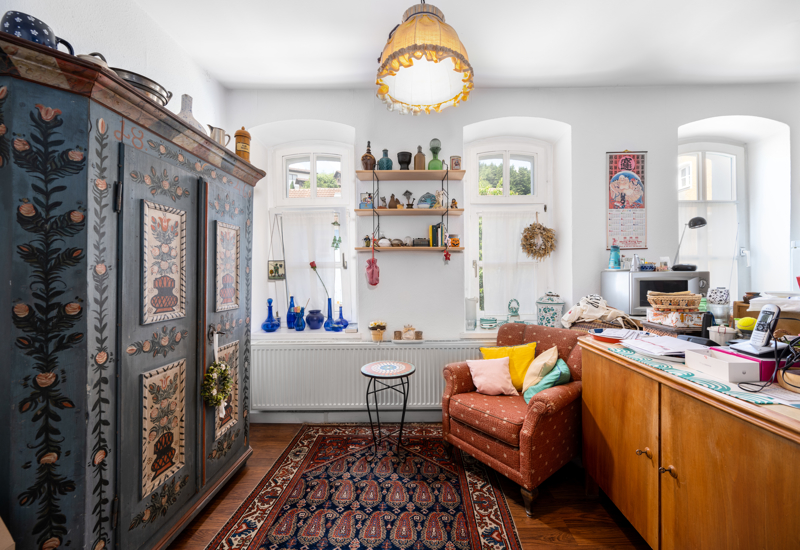 Im ersten und zweiten Stock befinden sich insgesamt vier Wohnungen, welche ebenfalls hochwertig renoviert wurden. Über eine umlaufende Holztreppe gelangen Sie ins Obergeschoss. Rechter Hand betreten Sie zunächst die rund 80 Quadratmeter große Wohnung eines langjährigen Mieters (Wohnung 1). Neben der Küche, einem Badezimmer und einem Abstellraum gibt es zwei weitere Wohnräume. Die zweite Wohnung im Obergeschoss verfügt über ca. 90 Quadratmeter (Wohnung 2). Auch hier gibt es neben der Küche, dem Badezimmer und eines großzügigen Flures, der hier zugleich als Wohnraum genutzt wird, zwei weitere Wohnräume. Eine absolute Besonderheit hier ist der Erker samt Balkon, welcher den Blick auf Schloss Wörth freigibt. Es ist übrigens der einzige Balkon der Straße, welcher auf die Ludwigstraße hinausführt.