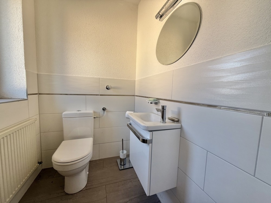 Die Wohnung im Obergeschoss hat ca. 85 m² und ist frei. Sie bietet 3 Zimmer, eine separate Küche, ein Badezimmer mit Badewanne und Dusche sowie eine separate Toilette. Vom Wohnzimmer aus gelangt man auf den Balkon mit Blick in den Garten, der im Sommer zu erholsamen Stunden einlädt. Zudem gibt es einen praktischen Abstellraum, der zusätzlichen Stauraum bietet.