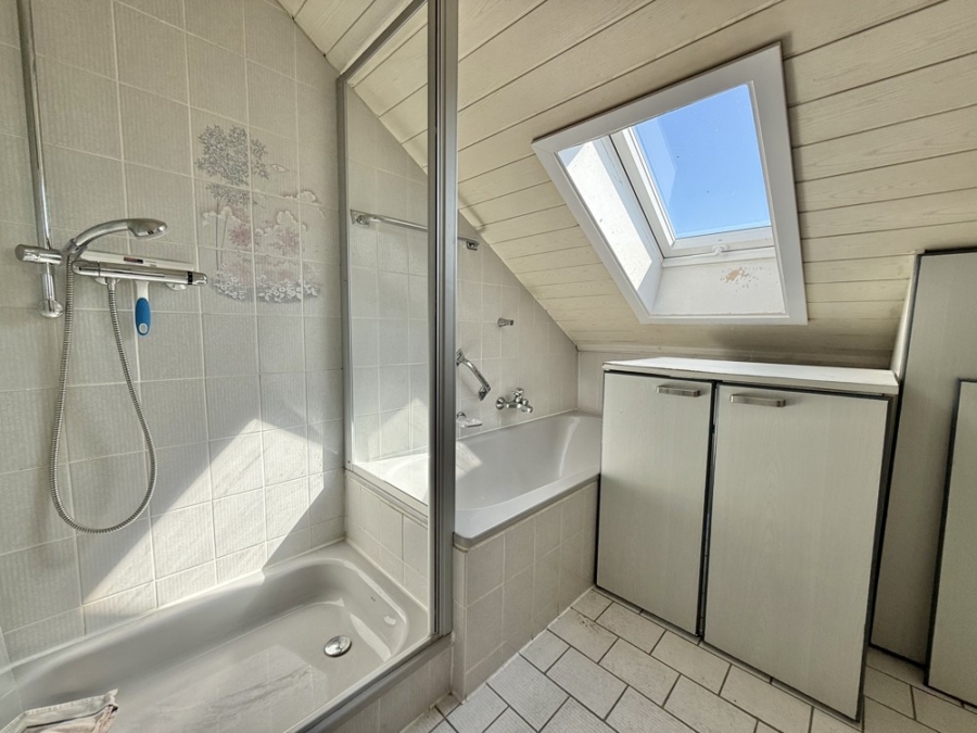 Das Dachgeschoss erstreckt sich über ca. 65 m² und bietet eine große, offene Wohn- und Küchenlandschaft. Hier ist Platz für eine moderne, offene Gestaltung. Die Wohnung umfasst zudem ein Badezimmer mit Badewanne und Dusche, ein separates WC sowie ein Schlafzimmer mit einem begehbaren Kleiderschrank. Der Balkon, der direkt vom Wohnzimmer zugänglich ist, ermöglicht einen schönen Ausblick und bietet Platz für eine kleine Sitzgelegenheit.