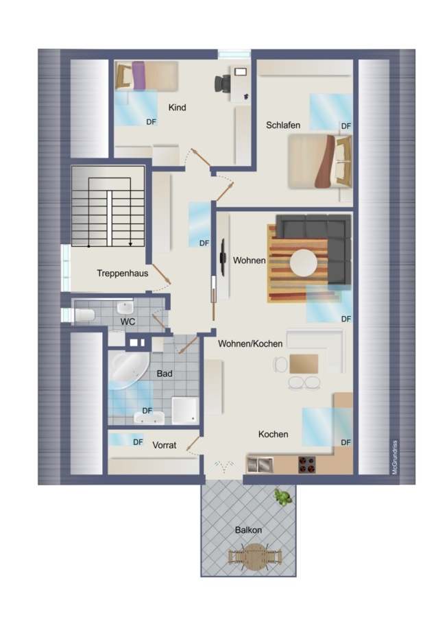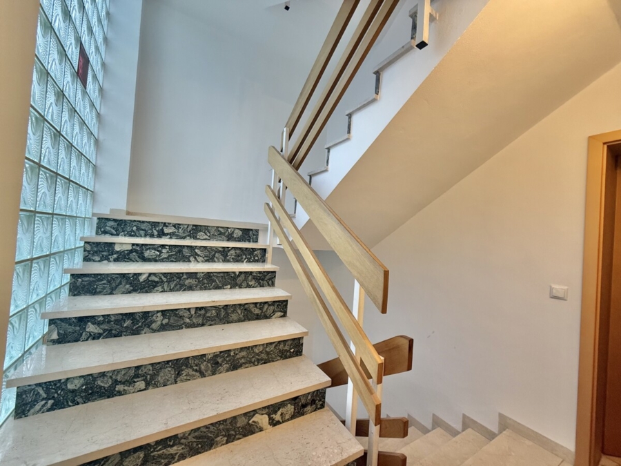 - Dachgeschoss: großes Bad mit Badewanne und Dusche, offene Wohn-Ess-Küche mit Balkon, zwei helle Schlafzimmer