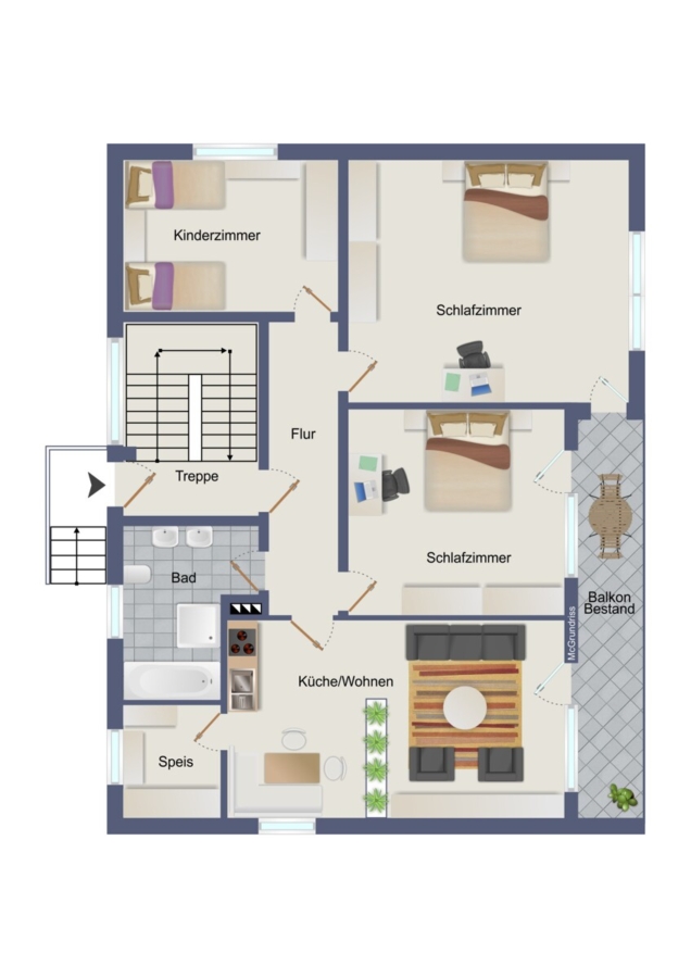 - Erdgeschoss: offene Wohn-Ess-Küche, Speisekammer, drei helle Zimmer, modernes Bad mit Dusche und Badewanne, großer Balkon