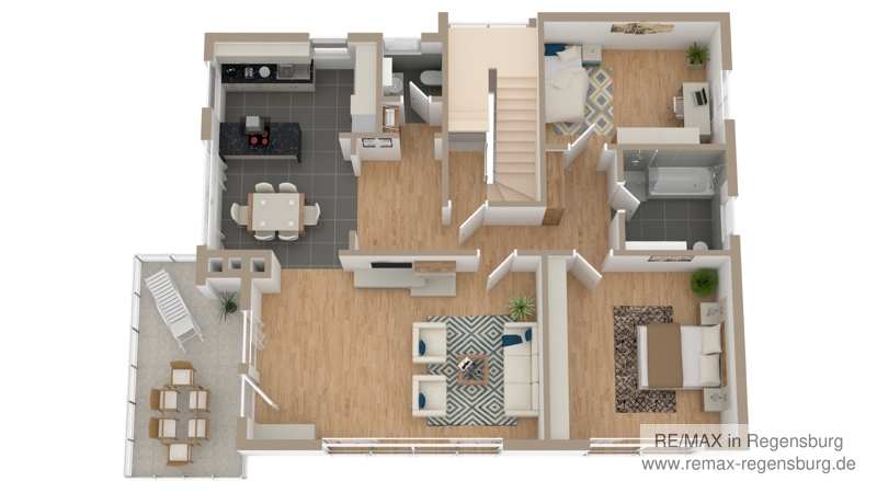 Im Erdgeschoss und im Obergeschoss befindet sich jeweils eine circa 102 m² große Wohneinheit mit einer großen Terrasse bzw. einem Balkon.