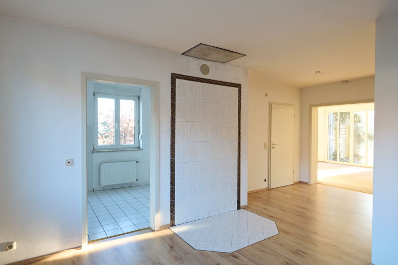 Zwischen Essbereich und Wohnzimmer verfügt der Raum über einen Kaminanschluß- hier kann jederzeit wieder ein Kaminofen eingebaut werden.