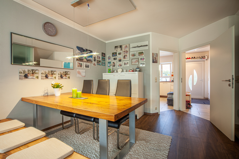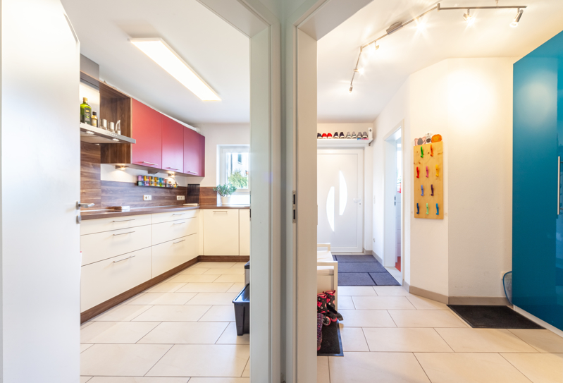 Im Erdgeschoß: Eingangsbereich mit Garderobe und Gäste-WC ein offener, einladender Durchgang in den großen hellen, modernen Wohn- Essbereich.