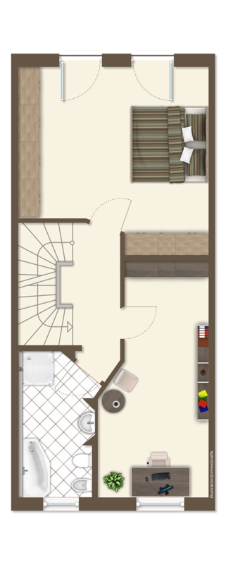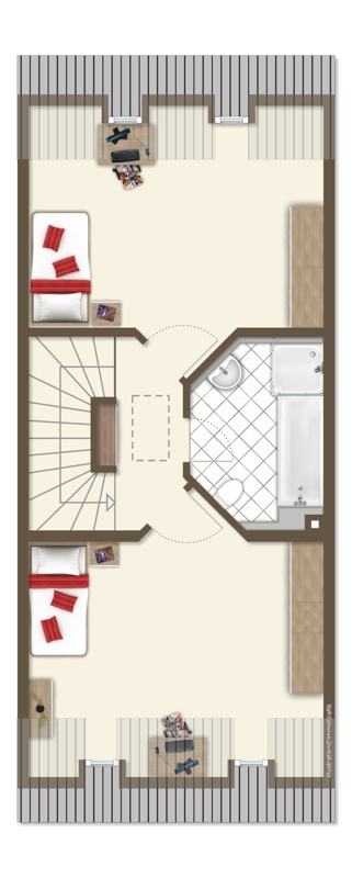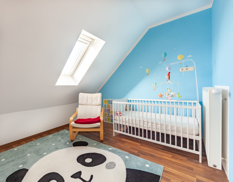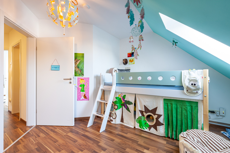 Das Dachgeschoß ist in Kinderhand, hier befinden sich zwei große, helle und einladende Kinderzimmer, außerdem ein eigenes Badezimmer für die Kinder.