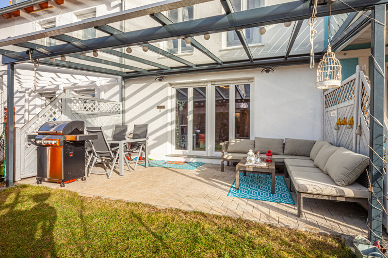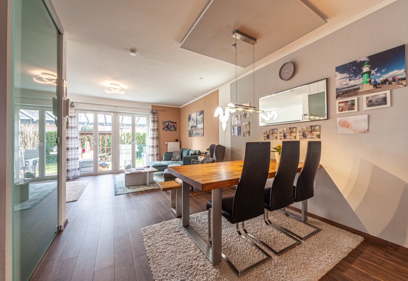 Highlights sind der Glaskamin und die große Fensterfront mit direktem Zugang zur Terrasse und dem schön angelegtem Garten. Die Terrasse mit Glasüberdachung und einer elektrischen Markise lädt zum gemütliche Verweilen und geselligem Zusammensein ein.