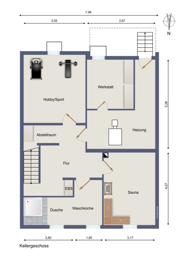 Im Keller finden Sie ausreichend Räume zur Ausübung ihrer Hobbys. Ja, sogar eine Sauna mit anschließender Duschmöglichkeit ist vorhanden. Von hier aus erreichen Sie auch bequem über eine Kellertreppe den Garten.