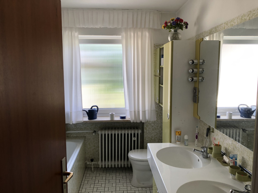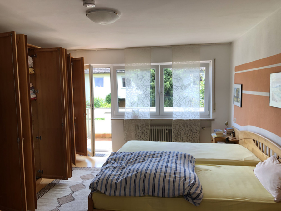 Im Obergeschoss befinden sich insgesamt vier Schlafräume oder so, wie es jetzt gestaltet ist, drei Schlafzimmer plus ein Musikzimmer bzw. begehbarer Kleiderschrank. Das große Elternschlafzimmer hat zudem einen Balkon. Ein für die ganze Familie ausreichend großes Badezimmer befindet sich ebenfalls hier.