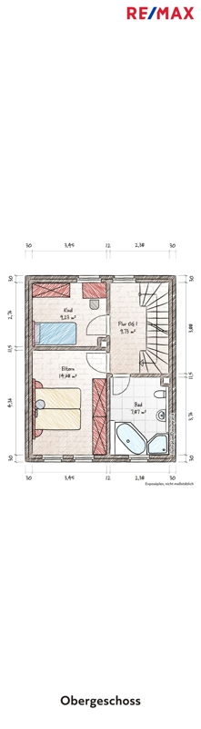Im Obergeschoss gibt es das Elternschlafzimmer, ein Büro und das Badezimmer mit Eckbadewanne und Dusche.