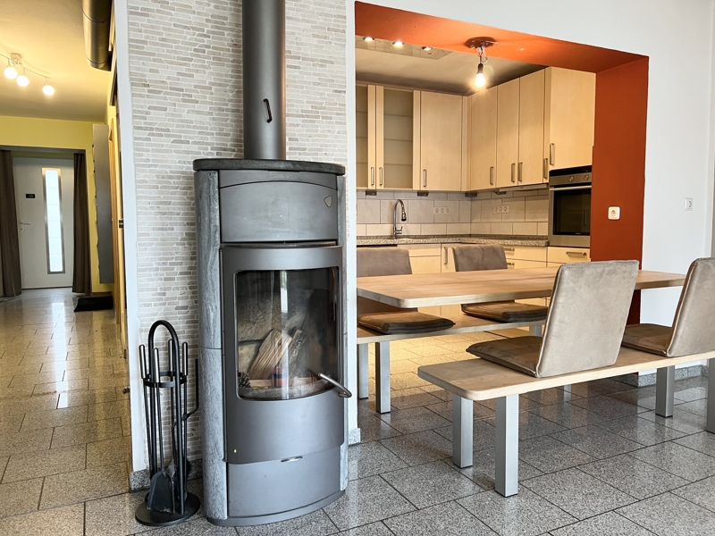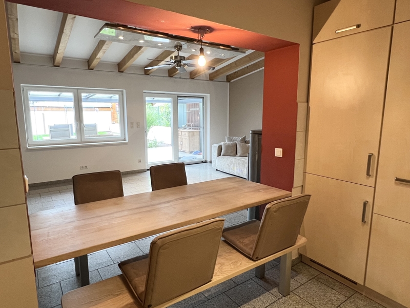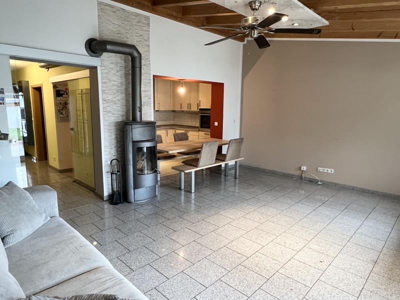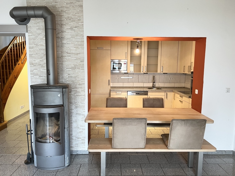 Im Erdgeschoß empfängt Sie eine Diele, ein Schlafzimmer, ein Gäste WC und die offen gestaltete Küche mit Essbereich und Wohnzimmer. Der im Wohnzimmer befindliche Specksteinofen, ist für den kommenden Herbst und Winter eine sichere Wärmequelle. Vom Wohnzimmer aus, haben Sie Zugang zur überdachten Terrasse, in den Garten und zur Garage.